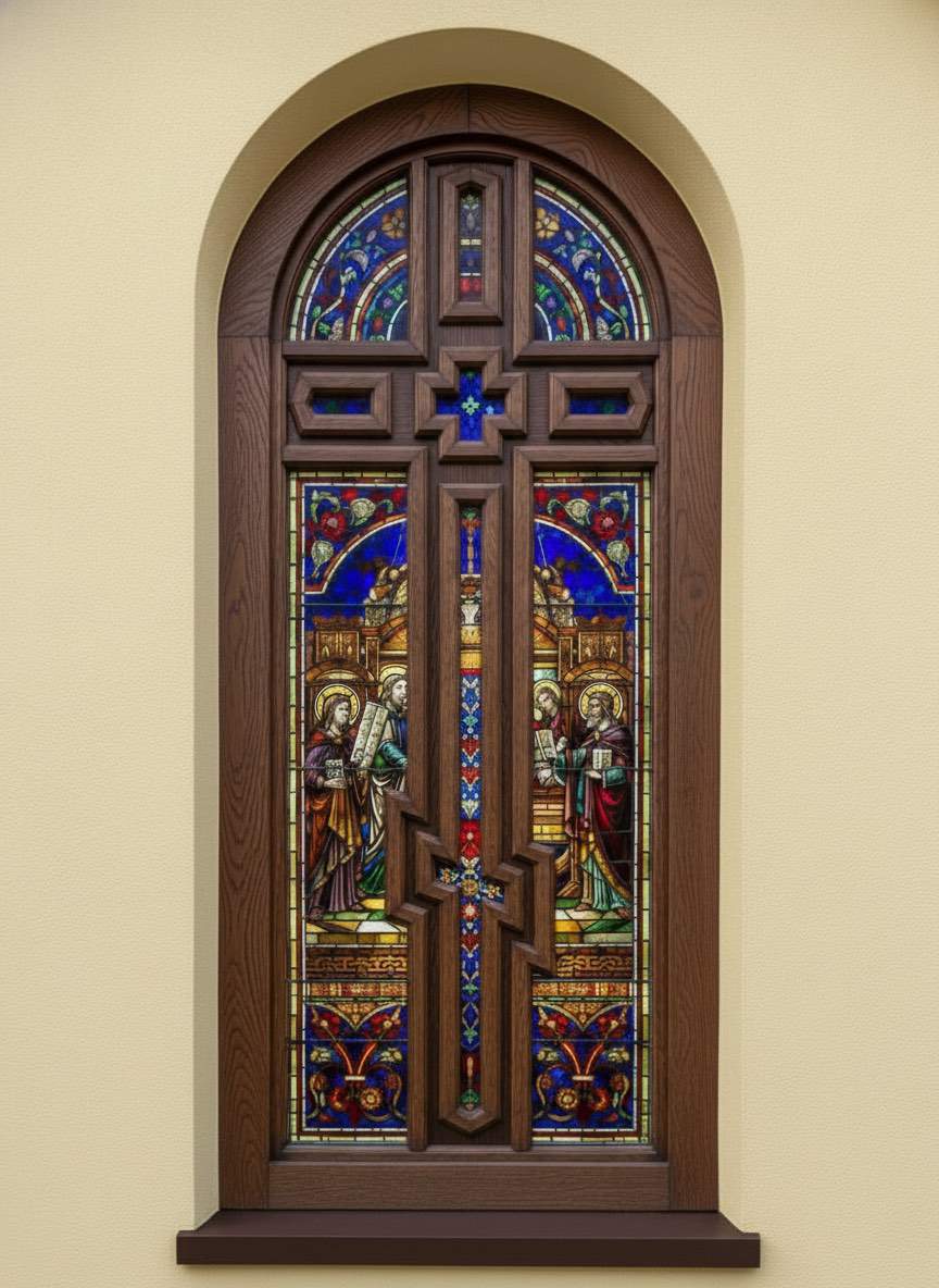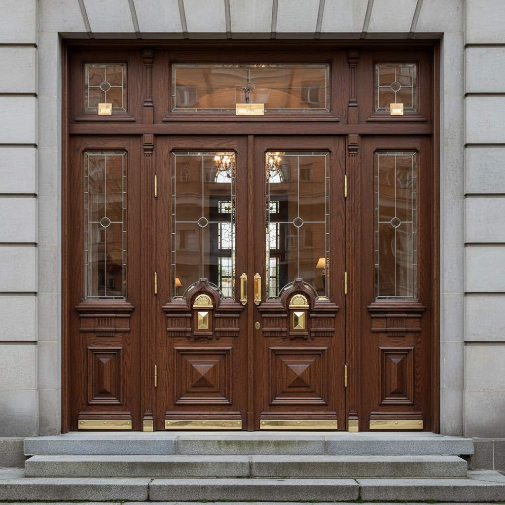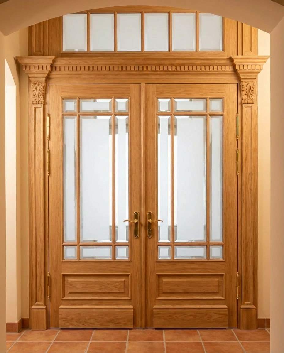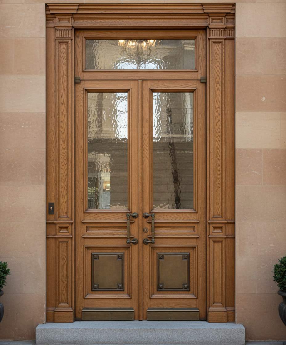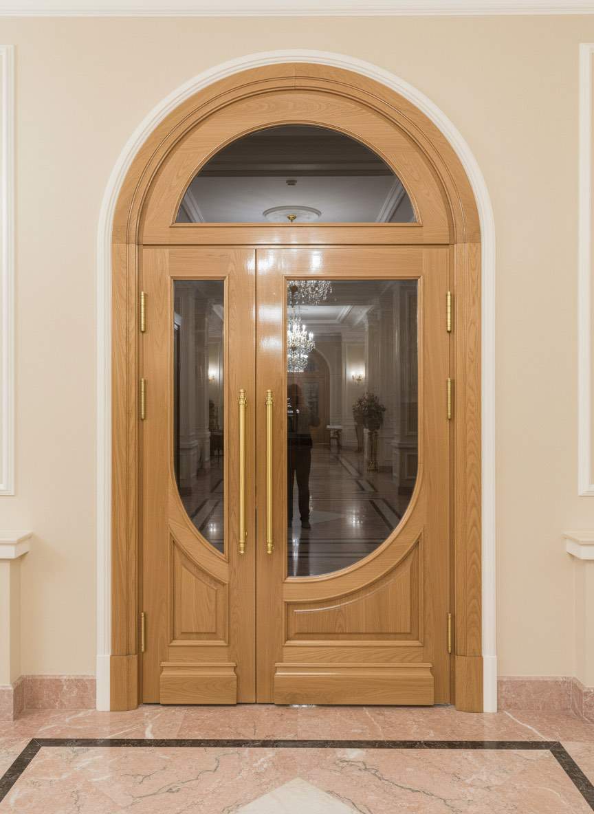 Входная дверь из массива дуба с порталом и витражом в кафе.