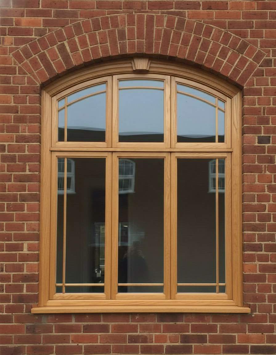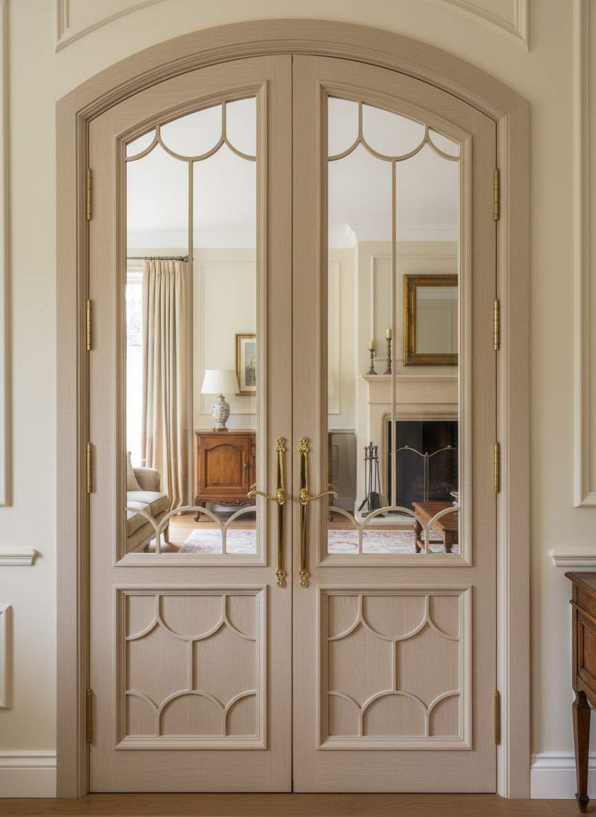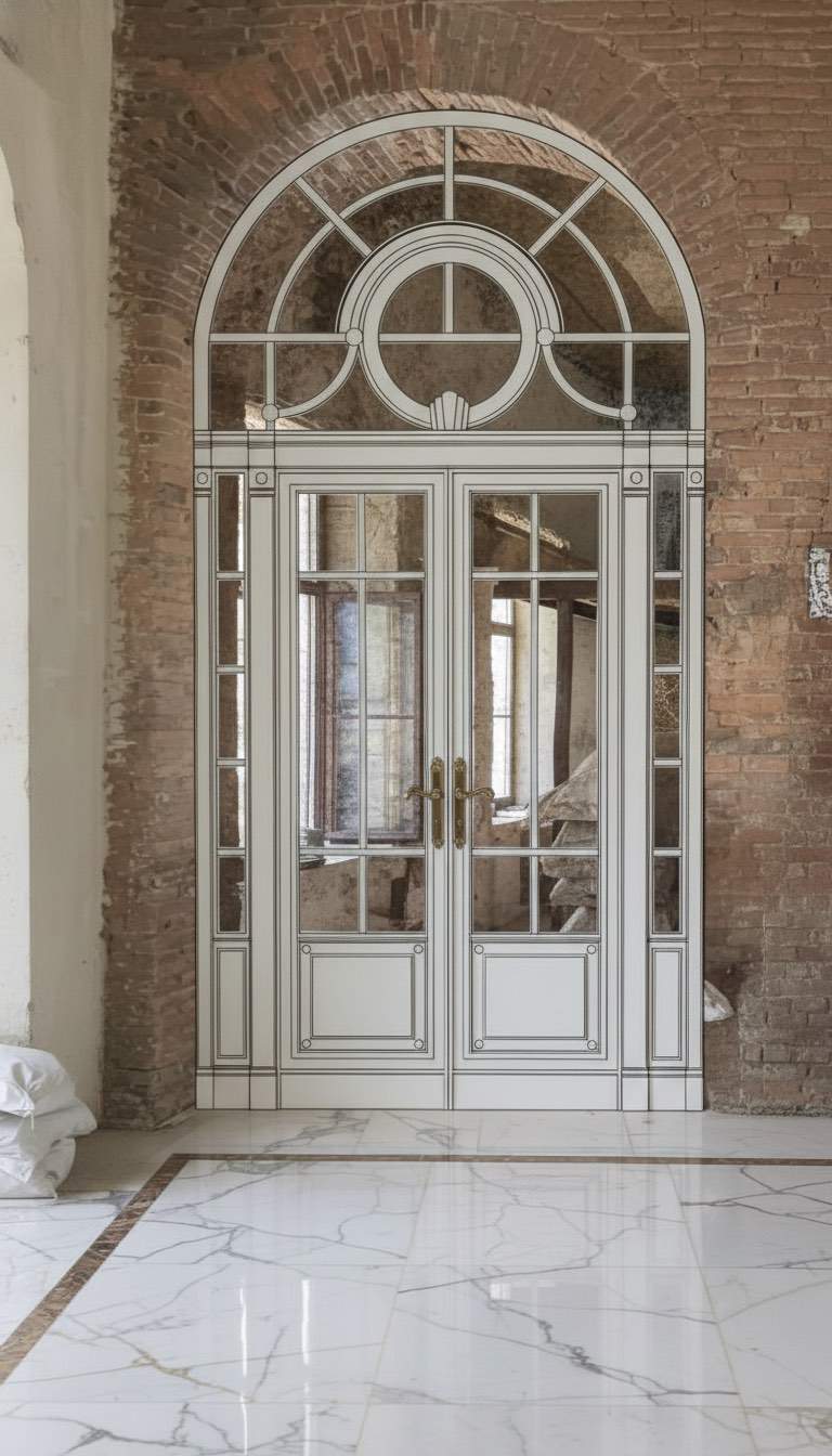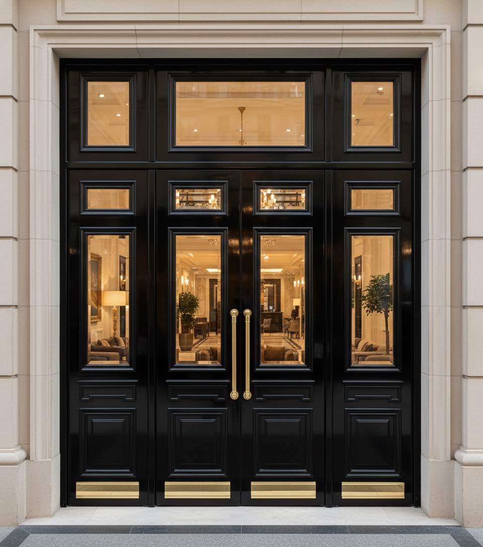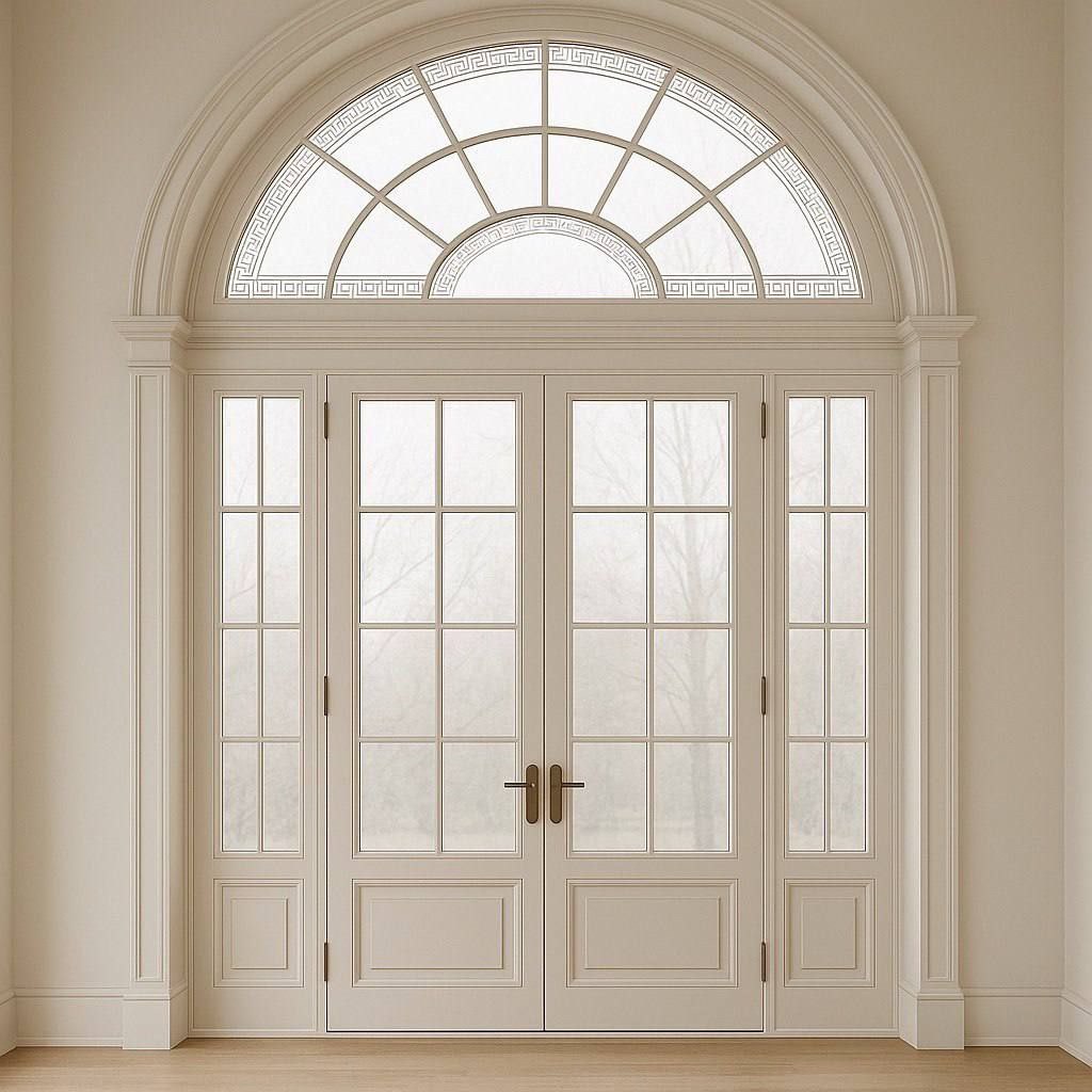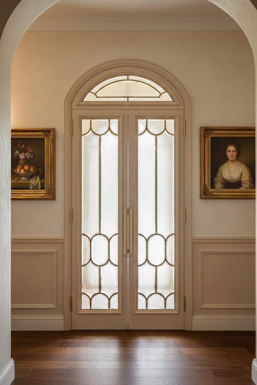Входная дверь из массива дуба с порталом и витражом в кафе.