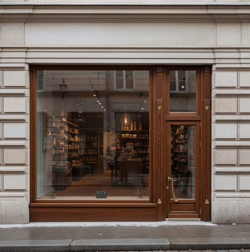 Входная дверь в магазин LINN, тонированная под красное дерево.