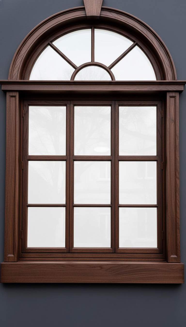 Историческое арочное окно из лиственницы, крашенное с латунной фурнитурой.